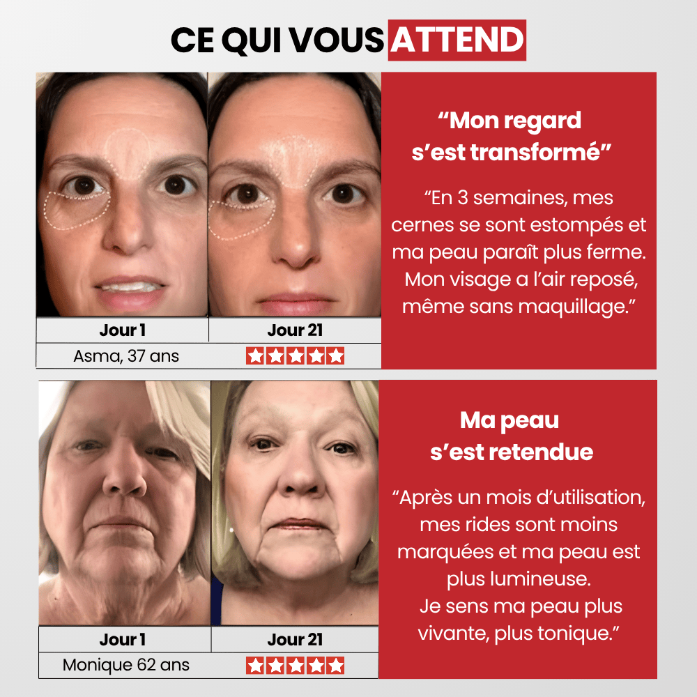 Les ridules s’adoucissent, la peau gagne en élasticité.Les contours se redéfinissent, pour un visage visiblement plus ferme et plus jeune.